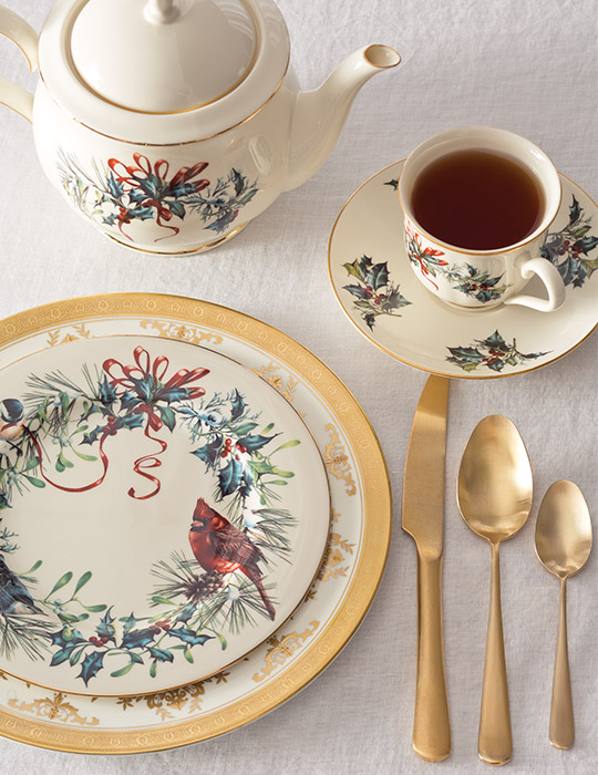 On Christmas Eve or Christmas Day, dress up Winter Greetings with a gold-rimmed dinner plate, Wedgwood Riverton. Metallic flatware, Herdmar Luxor by Pickard, reinforces the posh yet festive look.