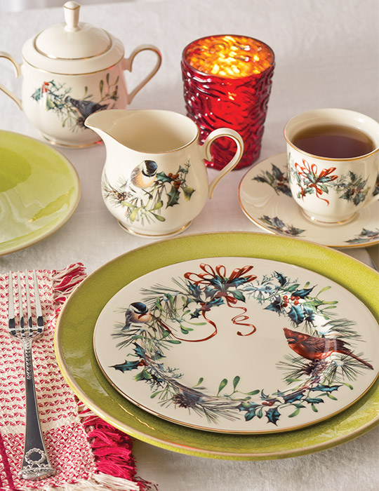 For a casual Christmas tea, add a pop of color with a Jars Tourron Avocado dinner plate. Ricci Argentieri Romanov Court flatware, embossed with wreaths, is a merry addition that is perfect throughout the season.