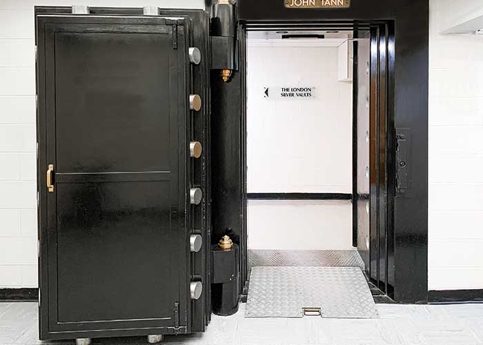 During World War II, on 7th September 1940, the first night of the Blitz, two incendiary bombs fell on the street above the Vaults and caused severe damage to the entrance at street level. But the Vaults, with their 4-feet-thick, steel-lined walls of reinforced concrete, were unharmed. However, on 25th September of the same year, another bomb made a direct hit on the building, causing a good deal of damage to the safe deposits and strong rooms. Once the war was over, a new building and entrance above the Vaults were constructed, and extensive repair work was carried out underground so The Chancery Lane Safe Deposit Company and Silver Vaults could once again guarantee total security to their clients. Since reopening in 1953, the Vaults, with their lock-up units in a warren of underground corridors, have served not just as secure storage space but as shops where more than 30 antiques traders buy and sell their valuable stock of silverwares and know that everything is completely safe. The subterranean entrance into the network of passageways and individual vaults is guarded by a timed, 7-tonne door that is only open during trading hours from 9:00 a.m. to 5:00 p.m. Monday through Friday and from 9:00 a.m. to 1:00 p.m. on Saturdays.