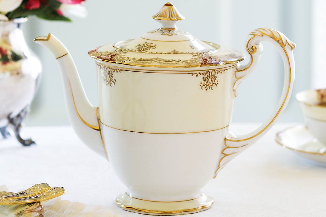 Lenox Tosca dinner plate and teacup/saucer set; Mikasa Cameo Gold flatware 5-piece place setting from Replacements, Ltd. Lenox Westchester dinner plate from Bromberg’s.
