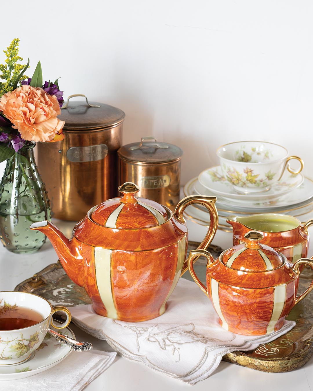 Lusterware tea set from PrettyPinkAddiction. Haviland Autumn Leaf footed cup and saucer set and bread and butter plate; Bernardaud BER10 salad plate; Gorham Silver Medici teaspoon from Replacements, Ltd. Antique linens, copper sugar and tea cannisters, tray, and bud vase from private collection.