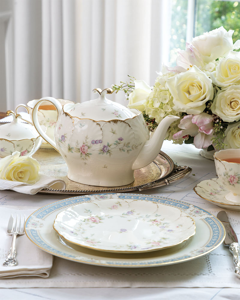 For a romantic tablescape befitting a Valentine’s Day affair, mix and match the pretty florals on Mikasa’s Remembrance teapot, footed cup and saucer set, salad plate, and sugar bowl with the beguiling blue trim on Mikasa’s Lexington dinner plate. Gorham Silver’s King Edward sterling cutlery adds attractive shine to the setting while modest linens offer texture to the look with the main focal point still being the treasured teapot.