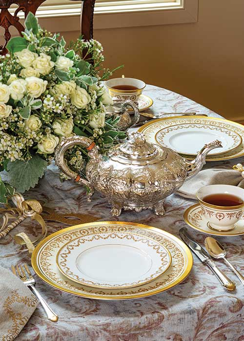 Ring in the new year with a gorgeous table worthy of bidding adieu to a memorable . Ellis-Barker’s Melon–Full Chased teapot shines in this stylish setting that marries gold and silver tones with perfect panache. Bernardaud’s BER81 dessert plates atop John Aynsley’s Gold Dowery dinner plates, alongside the accompanying footed cup and saucer sets, creates a gilded feast for the eyes. Complete the ensemble with Gorham Silver’s Edgemont Gold flatware, lovely linens, and masks for party favors, if desired.