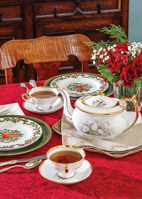 Usher in the Yuletide season with the eye-catching Spode Chatham teapot placed on a gorgeous table adorned in traditional holiday hues. A vibrant red tablecloth sets the scene for festive pieces such as Spode Royal Windsor’s green dinner plate and American Atelier’s darling Holiday Ribbon salad plate and Spode Chatham teacups to mingle, along with Reed & Barton’s glistening Francis I flatware.
