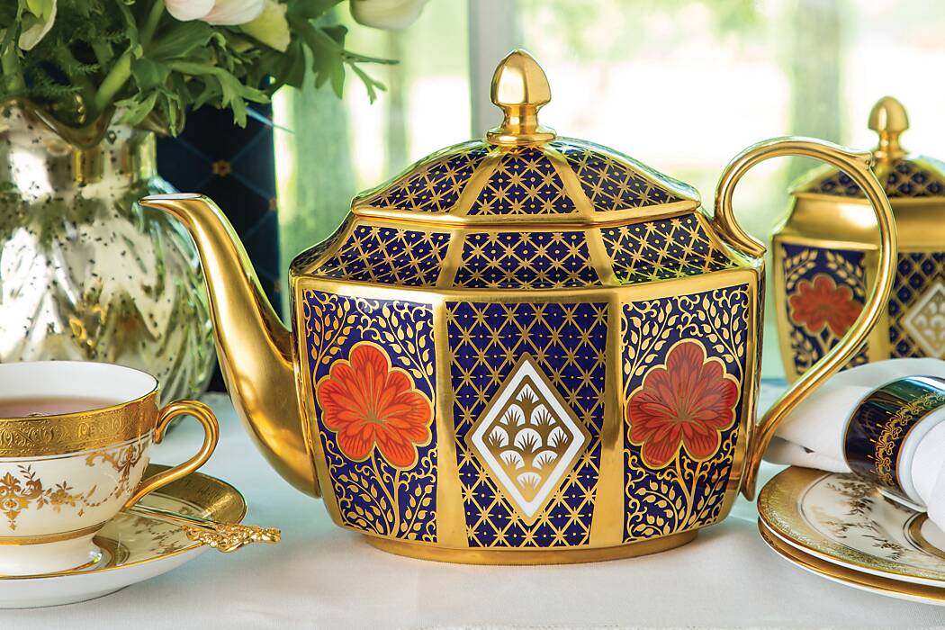 Resources include Caverswall Romany teapot and sugar bowl with lid; Minton Riverton footed cup and saucer set and salad plate; Christineholm Romanov napkin ring; Wallace Silver Golden Grande Baroque teaspoon from Replacements, Ltd. DKNY white napkins from HomeGoods.