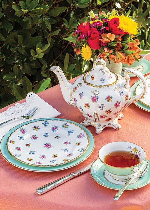 For a cheery summertime gathering, the Royal Chelsea 382A teapot and salad plate paired with Royal Worcester’s Miranda Light Green luncheon plate and footed cup and saucer create an attractive feast of color for the eyes. Adding elegant Gorham Silver Camellia flatware and a bright coral tablecloth completes the delightful look.