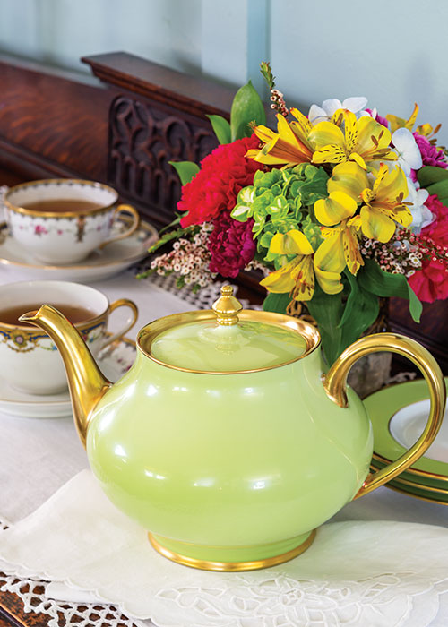 Haviland “Laque de Chine Gold” (Pistachio) teapot and bread and butter plate; Jean Boyer “BOJ1” flat cup and saucer set; Haviland Schleiger “920” flat cup and saucer set from Replacements, Ltd. Antique linens from private collection.