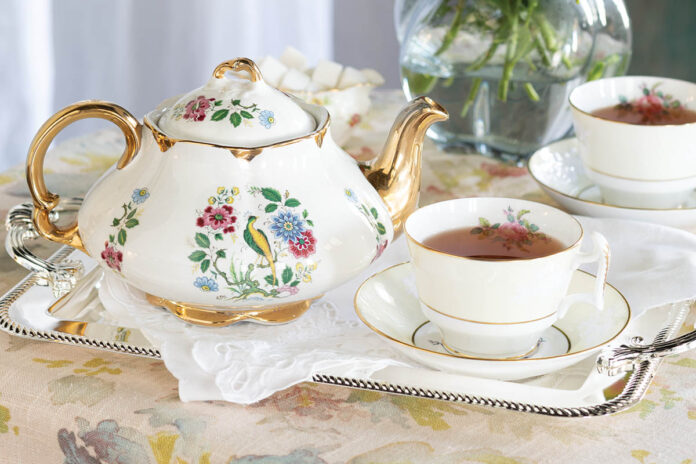 Adorn your midsummer tea table with Wood & Sons’ Ellgreave 35 teapot that is covered with flora and a feathered friend.