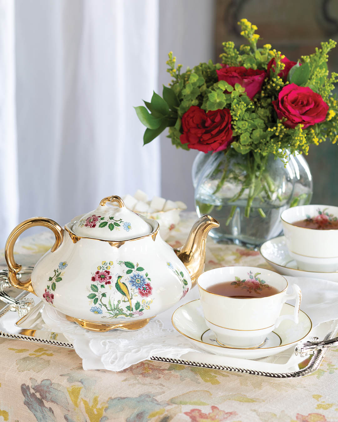 Wood & Sons’ Ellgreave 35 teapot and Spode Maritime Rose (yellow) teacup and saucer set available for rent at Tea and Old Roses. Blue glass vase from Target. Corbell Silver Queen Anne rectangular handled tray from Corbell Silver.
