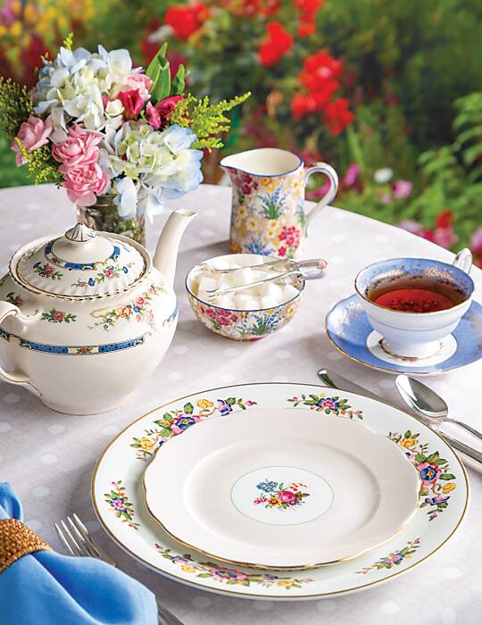 As the season prepares to come to an end, highlight the assemblage of delicate blossoms etched upon the Eastbourne (Old English) teapot by pairing it with the botanical designs shown on Aynsley’s Capistrano dinner plate, Grosvenor’s 9980 salad plate, Westbrook teacup and saucer of an unknown pattern, and Royal Winton’s Grimwades creamer and sugar bowl. These teatime accoutrements shine when set against a neutral tablecloth and beside bold, blue napkins.
