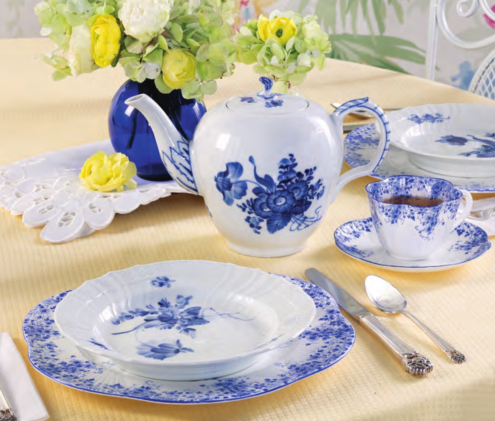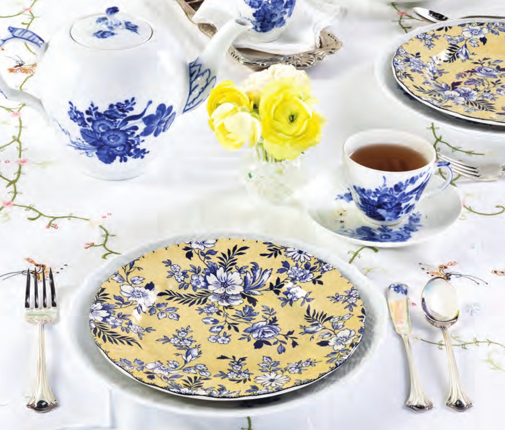 Royal Copenhagen Blue Flowers Curved teapot and flat cup and saucer set from Replacements, Ltd., 800-737-5223, replacements.com. Antique linens and vessel for flowers from private collection. [Abounding Blues] Royal Copenhagen Blue Flowers Curved salad plate; Shelley Dainty Blue flat cup and saucer set and dinner plate from Replacements, Ltd., 800-737-5223, replacements.com. International Silver Eternally Yours silverplate cutlery available for rent at Tea and Old Roses, 205-413-7753, teaandoldroses.com. Matouk Savannah Gardens tablecloth in Butter from Matouk, 855-795-7600, matouk.com. Antique linens and vessel for flowers from private collection. [Cheerful Springtide] Royal Copenhagen Blue Flowers Curved dinner plate and creamer; Johnson Brothers Devon Cottage accent salad plate in yellow; International Silver Serenity silverplate individual salad fork, teaspoon, and flat handle butter spreader from Replacements, Ltd., 800-737-5223, replacements.com. Embroidered tablecloth, antique napkins, silver tray, and vessel for flowers from private collection.