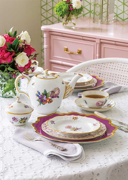 Floral pieces—like a vibrant Saxon Flower teapot, teacup and saucer set, sugar bowl, and dessert plate, alongside the dainty blooms decorating Royal Albert’s Rose Confetti salad plate—integrate flawlessly with the stunning hue that borders Anna Weatherley’s Anna Palette Purple Orchid dinner plate. The ornate detail on Gorham Silver’s Buttercup flatware incorporates lovely shine, while lavender napkins and a white eyelet tablecloth add feminine sweetness to the tablescape.
