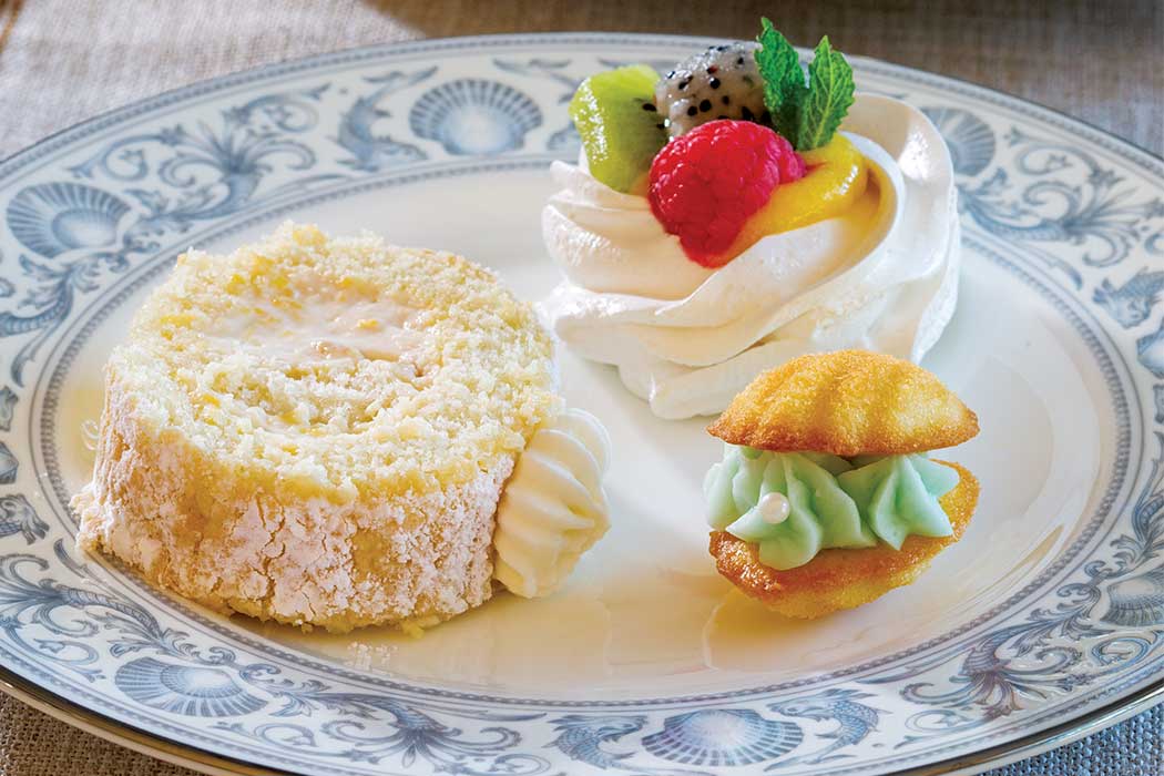 Pretty piped meringue shells create a fanciful vessel for sumptuous Passionfruit Curd and a medley of fresh fruit. Pictured with our Coconut Madeleine Clamshells and Mango Swiss Roll.