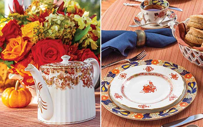 Samuel Radford Victorian Rust teapot; Wood & Sons Wincanton Blue and Rust flat cup and saucer set and dinner plate; Herend Princess Victoria Rust creamer and covered sugar bowl; Herend Chinese Bouquet Rust salad plate, 6-inch cachepot, 8-inch round open weave basket, open sauce boat, 15-inch oval serving platter, and 12-inch round tray with handles; Coalport Hong Kong footed soup bowl and saucer set; Cristal D’Arques-Durand Longchamp (clear) small dessert bowl; Reed & Barton Guildhall New French hollow knife, salad fork, and teaspoon; Reed & Barton Spanish Baroque demitasse spoon and round bowl soup spoon from Replacements, Ltd. Tablecloth and napkin rings from HomeGoods. Cotton Buffet Napkins in Dark Indigo Blue from World Market. Vessel for centerpiece from private collection.