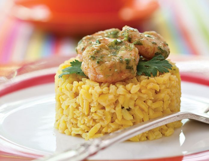- Cook yellow rice according to package directions, substituting seafood stock for water and adding butter.